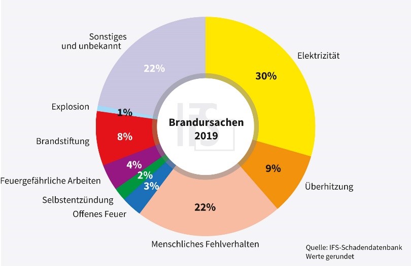 Anhand des Diagrammes der IFS-Schadendatenbank wird verdeutlicht, dass ein Großteil der Brände durch Elektrizität verursacht worden ist, gefolgt von menschlichem Fehlverhalten und sonstigen oder unbekannten Ursachen.
